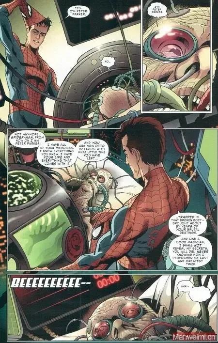 但是,蜘蛛侠的一部分思维还残留在他的身体里,并且最终他能够和章鱼博士在他俩共享的脑子里对话。他们打了一场精神仗,最终是章鱼博士获得胜利, 不久之后,他把彼得的记忆全部从脑海中删除了。