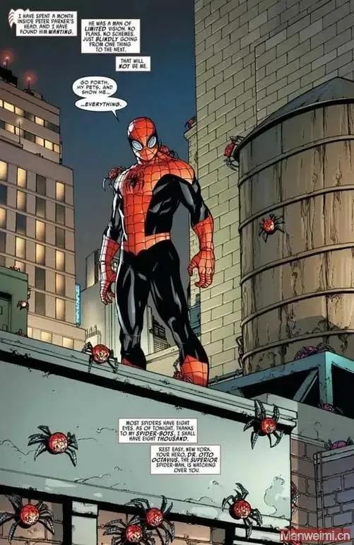 章鱼博士想成为超凡的蜘蛛侠,于是回到学校去,完成彼得没能取得的博士学位。他还和一个新的女子约会,和市长詹姆森并肩作战打击罪犯,还用许多雇佣兵和大量机器蜘蛛帮助市长在城市巡逻。