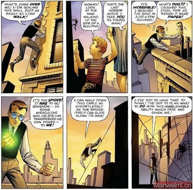 高中时期,彼得在参加一次关于放射学的科学展览课外活动中,在那里他意外的被一只受过放射性感染的蜘蛛咬伤,这使他获得了蜘蛛一般的特殊能力,并且能在任何物体上毫不费力的爬行(依靠生物静电),还具有了一种敏锐的超感知“蜘蛛感应”。