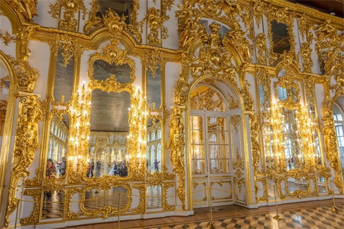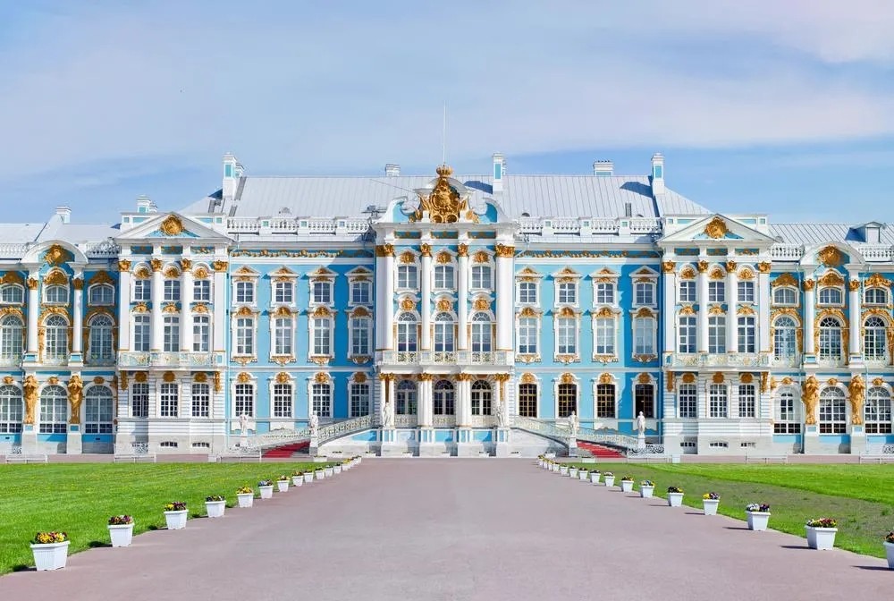 叶卡捷琳娜宫又称凯瑟琳宫,位于圣彼得堡以南约25公里处,是1717年特别为彼得一世的妻子、也是其女儿伊丽莎白女皇、叶卡捷琳娜二世、亚历山大一世及尼古拉二世喜爱的郊外行宫。为了彰显身份,宫殿所处的一带在其建成后即被称为沙皇村或皇村。1937年为纪念普希金在此度过童年又改为现名“普希金村”。