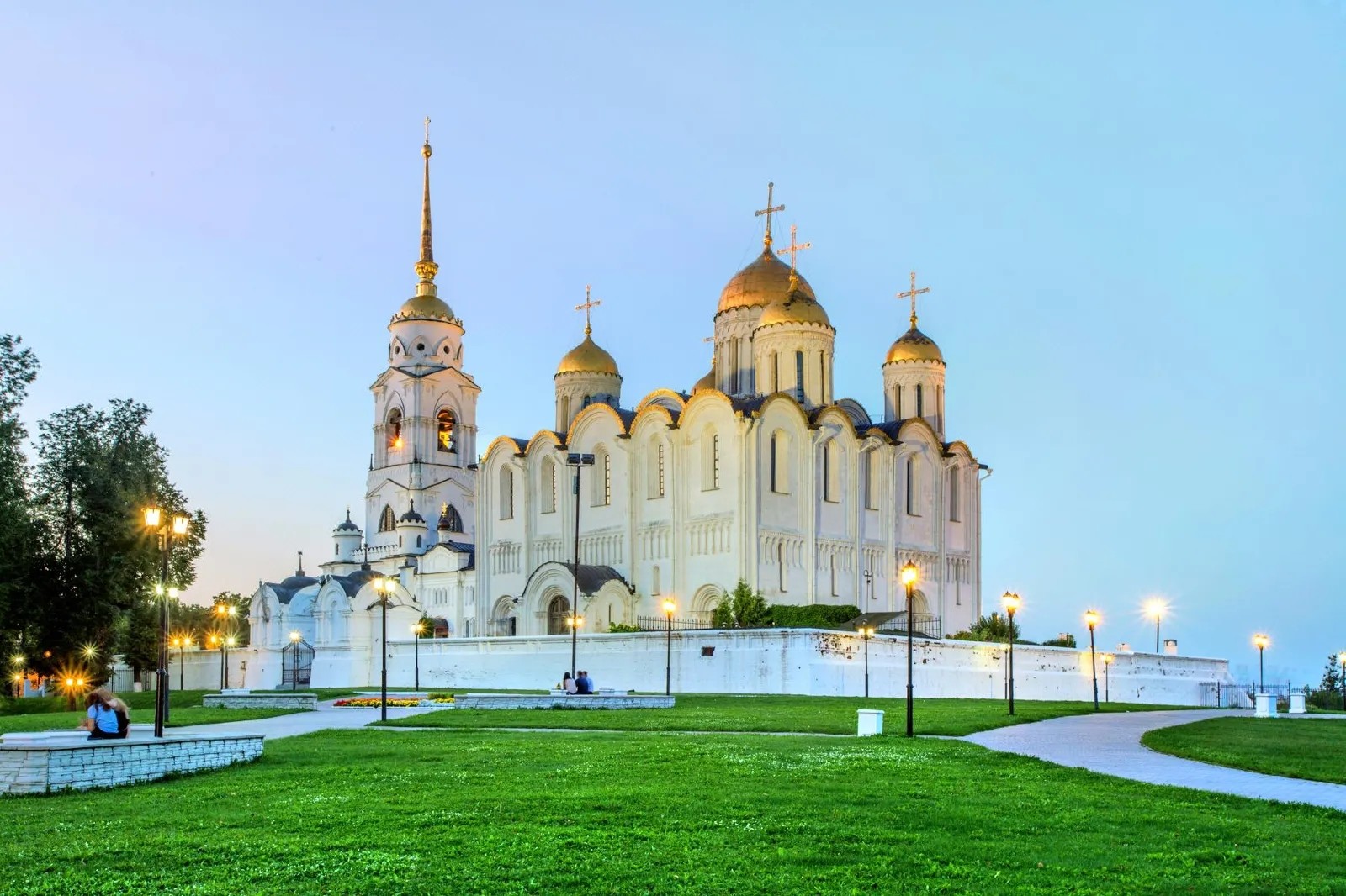 圣母升天大教堂坐落在市区克利亚济马河岩陡峭高地上,是俄罗斯现存非常古老的教堂。以12世纪当地流行的“五色人工宝石建筑结构”而闻名,是12世纪俄罗斯建筑中十分伟大的创造之一。在12到15世纪期间,沙皇都在此加冕。到了19世纪,由于原教堂不再使用,在原教堂右侧盖了白色大石教堂。教堂内还有文化中心、图书馆等。