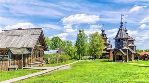 1968年所建成的木造建筑博物馆,整个博物馆是露天的。其中有从附近各地搬迁来的古代俄罗斯民居木屋,还有冬天教堂、夏天教堂,商店,一旁还有传统水井、水车、以及磨面粉用的风车,就像是几百年前的俄罗斯小镇重现眼前一样。