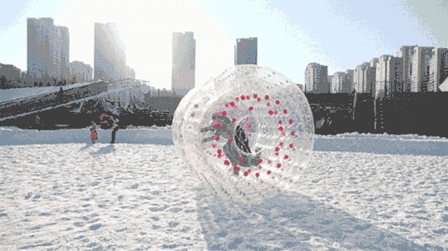 通体透明的圆球或滚筒,可以想象在蓝天白云之下,一只巨大的透明球体在雪地上一路翻滚,球内的乘坐者体验着天旋地转的感觉,绝对是既刺激又新鲜。