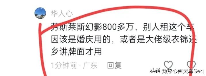 一网友留言“劳斯莱斯幻影800多万,别人租这个车应该是婚庆用,或者是大佬级衣锦还乡才讲排面”!