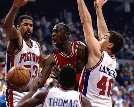 为了对付得分能力不可阻挡迈克尔乔丹,1988年以赛亚·托马斯设计了乔丹法则,底特律活塞其他球员执行,比尔·兰比尔及丹尼斯·罗德曼作为防守主力。其重点在于“强韧的跟他玩,用肢体去挑战他,快速改变防守方式,让他在失去平衡下投球”。采用各种方法死防乔丹,无所不用其极,实在防不住乔丹时 ,就“放掉乔丹”, 死防其他4个人, 即使乔丹得再多的分别的4个人得分很低公牛照样输球 。当然活塞说是“放掉乔丹”,其实是让一个人用尽“一切办法”来完成对乔丹的防守,就是不惜一切代价甚至是犯规来打乱乔丹的进攻节奏 ,使得乔丹不能很好的得分进攻。