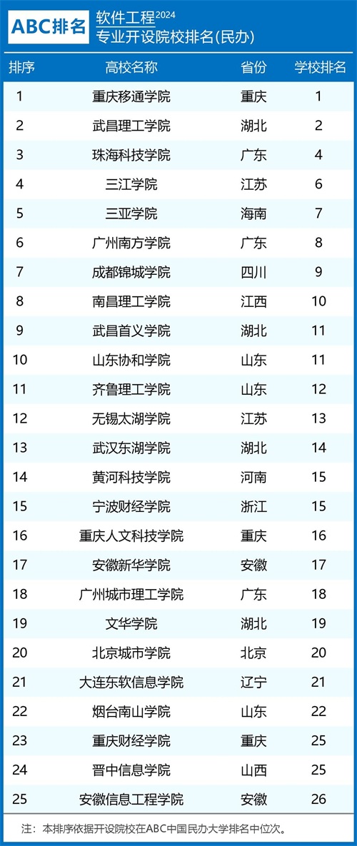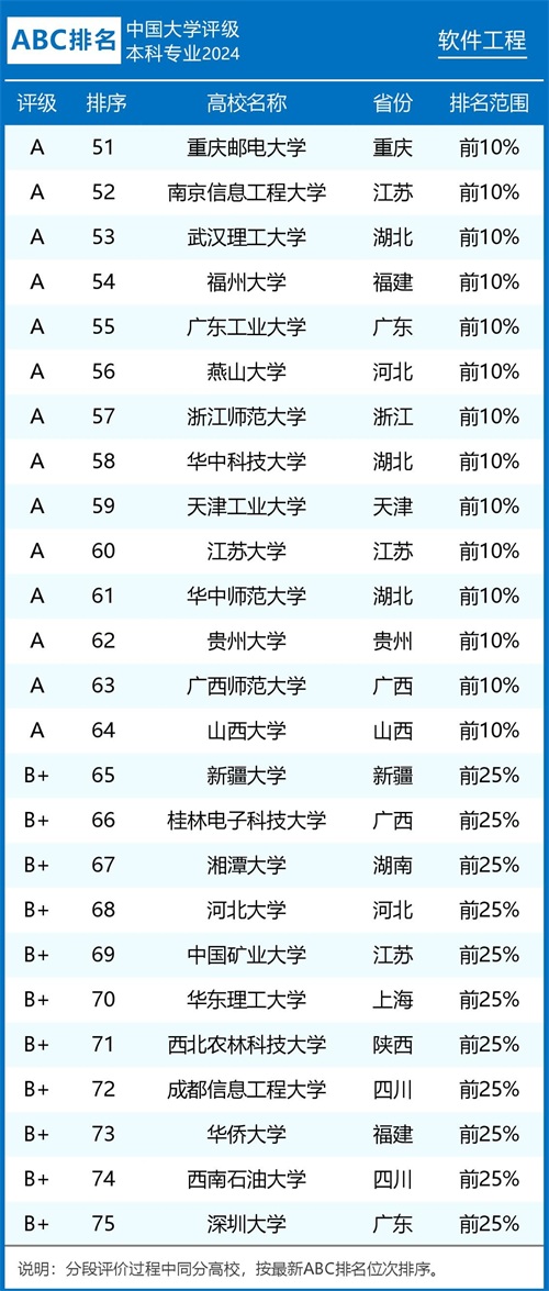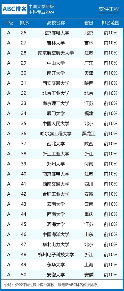 2024年ABC中国大学软件工程专业排名及评级结果显示: