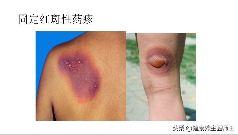 1、固定红斑型 圆形紫红色水肿斑,好发于腔口周围食后有色素沉着,重复用药在原处复发。