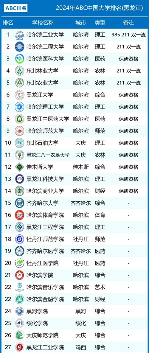 黑龙江高校排名调整:哈工程第2,黑龙江大学第6,佳木斯大学第12