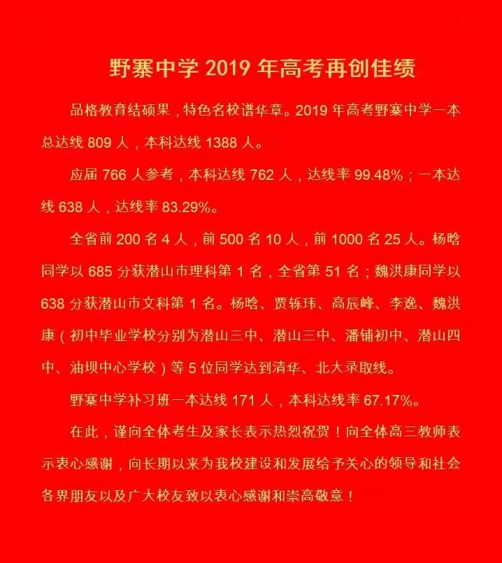 今年我校高考再创佳绩:全校600分以上共160人,(文科36人,理科124人),文科张彬帅同学以656分列全省第19名,安庆市第一名;陈卓同学以651分列全省47名,安庆市第二名;理科王可同学以678分列全省第108名,另有3名同学进入全省理科前200名。全校一本达线850人,本科达线1691人(上述数据均不含体艺)。