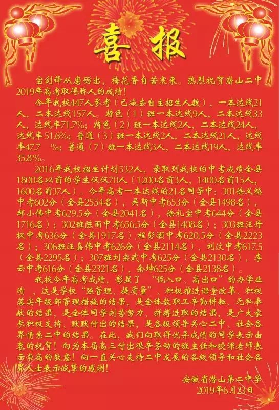 这一成绩的取得是各级领导关心支持的结果,是全体高三老师呕心沥血、辛勤耕耘的结果,是全校教职工齐心协力、团结奋进的结果。学校向创造这一佳绩的全体高三老师表示热烈的祝贺,向为学校发展辛勤奉献的广大职工表示崇高的敬意,向关心支持二中发展的各级领导、各位家长、社会各界表示衷心的感谢!