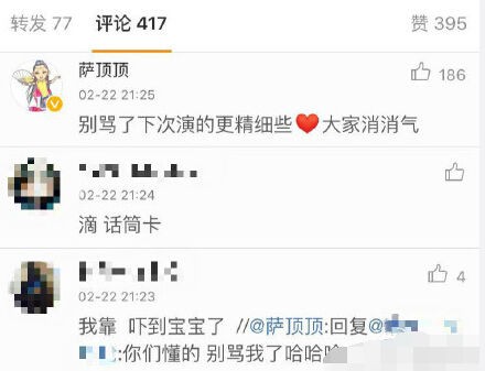 对于网友的指责和不满,萨顶顶稍后在自己白天发表的微博节目预告单中作出回应,称:“别骂了下次演的更精细些,大家消消气!”