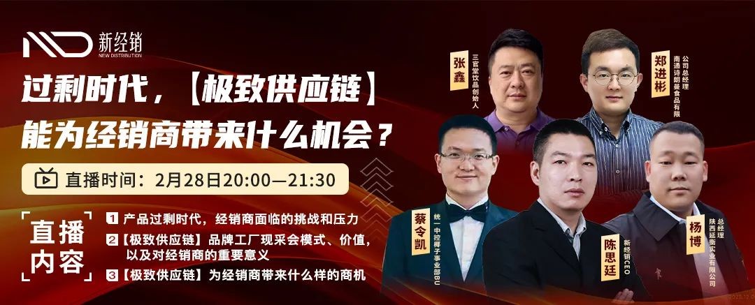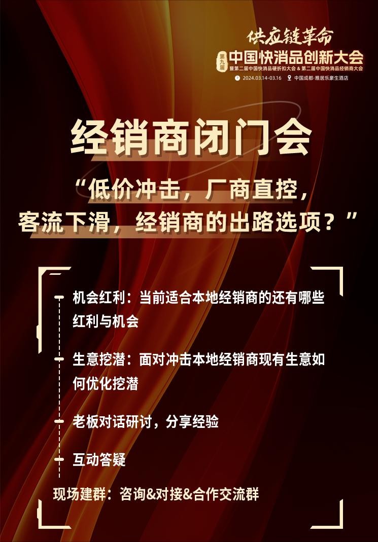 3月15日,将举办一场经销商闭门私享会“低价冲击,厂商直控,客流下滑,经销商的出路选项?”与优秀大商一对一对话研讨,分享经验,挖掘生意机会,讨论时代红利。