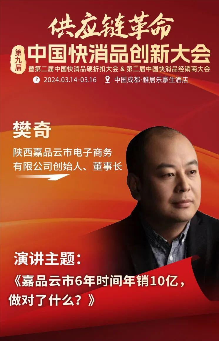 陕西嘉品云市电子商务有限公司创始人、董事长樊奇确认出席第二届中国快消品经销商大会并发表主题演讲——《嘉品云市6年时间年销十亿,做对了什么》。