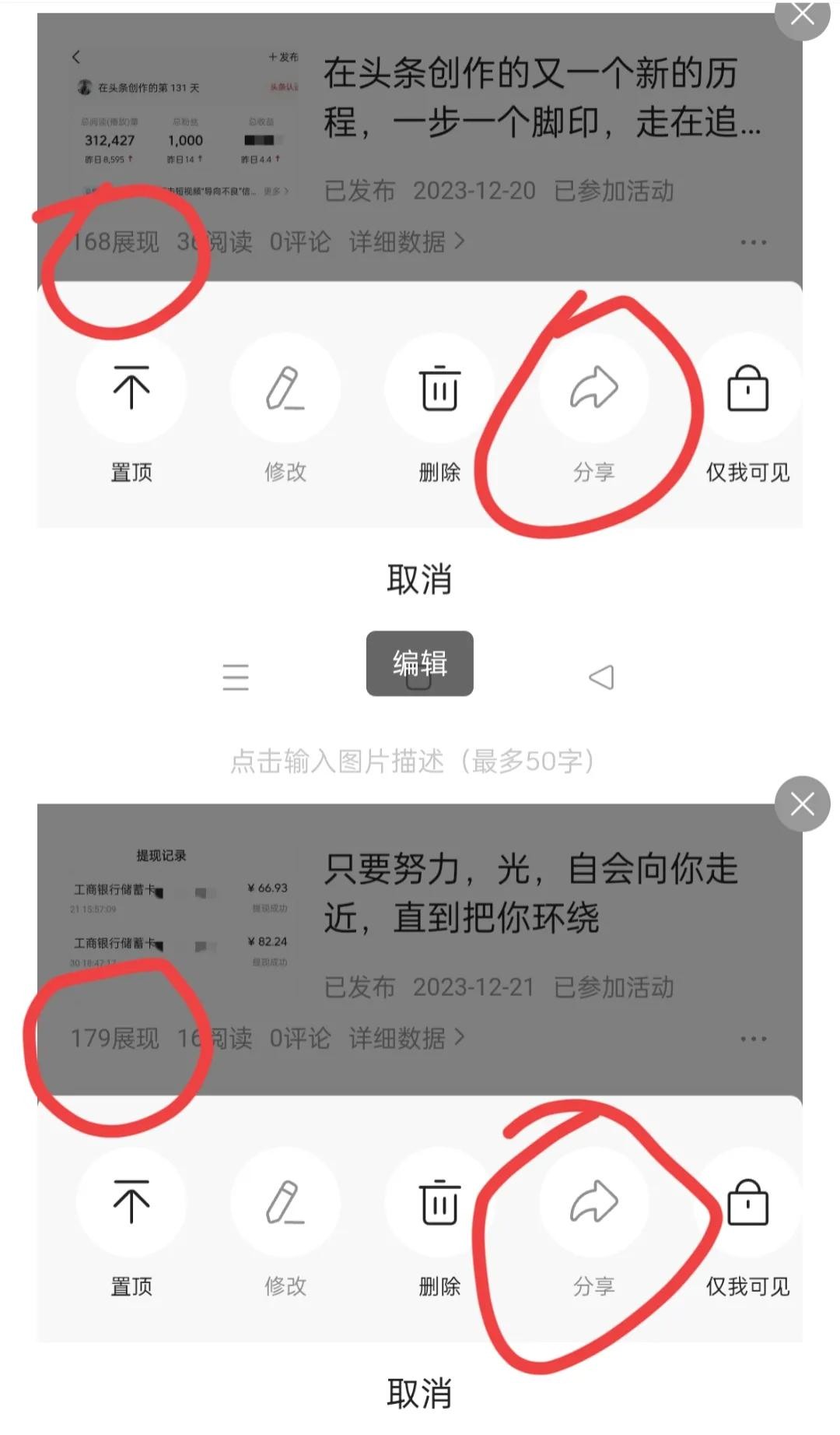 如上图所示,这个才是一个作品真正被限流并关进“小黑屋”的情况。作品的展现量跟没有没什么两样,并且,是完全不给你机会往外分享,不给你自己激活展现的机会!这两个作品除了不能往外分享之外,连自己的粉丝也是完全看不到的。
