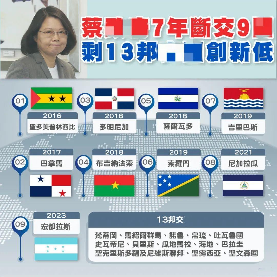 2023年3月25日洪都拉斯外交部宣布与中国台湾当局断绝所谓的“外交关系”。洪都拉斯在这一天与中国签署了《中华人民共和国和洪都拉斯共和国关于建立外交关系的联合公报》。至此中国已与世界上182个国家建交,与此同时台湾当局所谓的“邦交国”数量已减少到13个。这其中帕劳、瑙鲁、马绍尔群岛、图瓦卢四国为太平洋岛国;巴拉圭、伯利兹、危地马拉、海地、圣基茨和尼维斯、圣卢西亚、圣文森特和格林纳丁斯七国位于中南美洲。