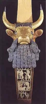 出土的面具、祭司组雕只剩、公牛头(牛头竖琴) 、"乌尔军旗"等,堪称精美。