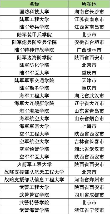 不难发现的是,这七所军校全部都位居全国前100强行列,也就是说军校的综合实力是非常强劲的,就算考生的分数不能够达到提前批有军籍专业的录取要求,军校的普通类专业也是非常值得报考的。