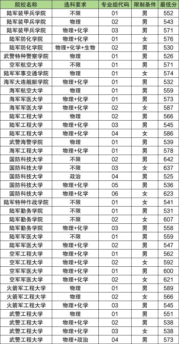 陆军装甲兵学院543分、陆军防化学院530分、空军航空大学571分、武警特种警察学院526分、海军航空大学559分、海军工程大学578分......