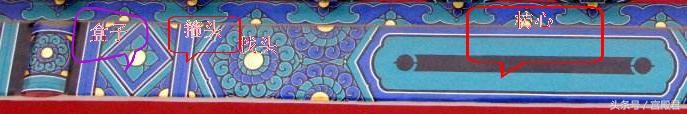 额枋上的彩绘主要由图上的这几个部分组成:箍头、盒子、找头、枋心。