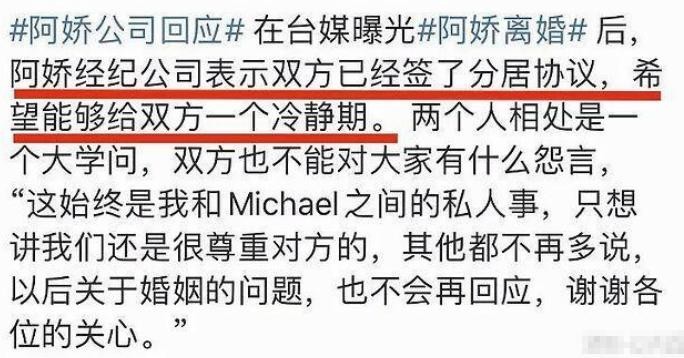 但本以为找到一生挚爱的阿娇,近日却传出两人即将离婚的消息,但是阿娇本人却没有任何回复,只是其所在的经纪公司发文:两人现在已经签署了分居协议。