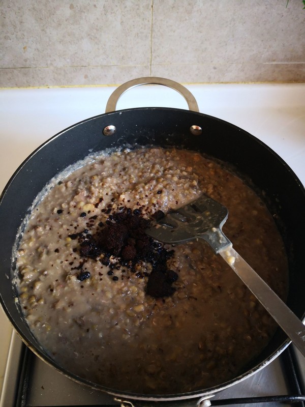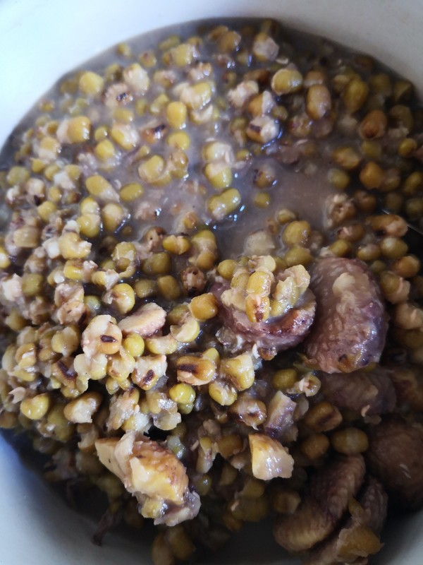 4.加入煮熟的绿豆,栗子。