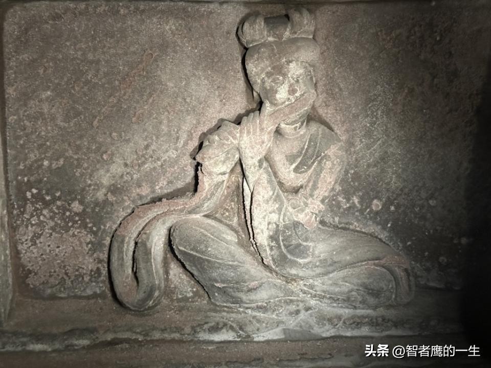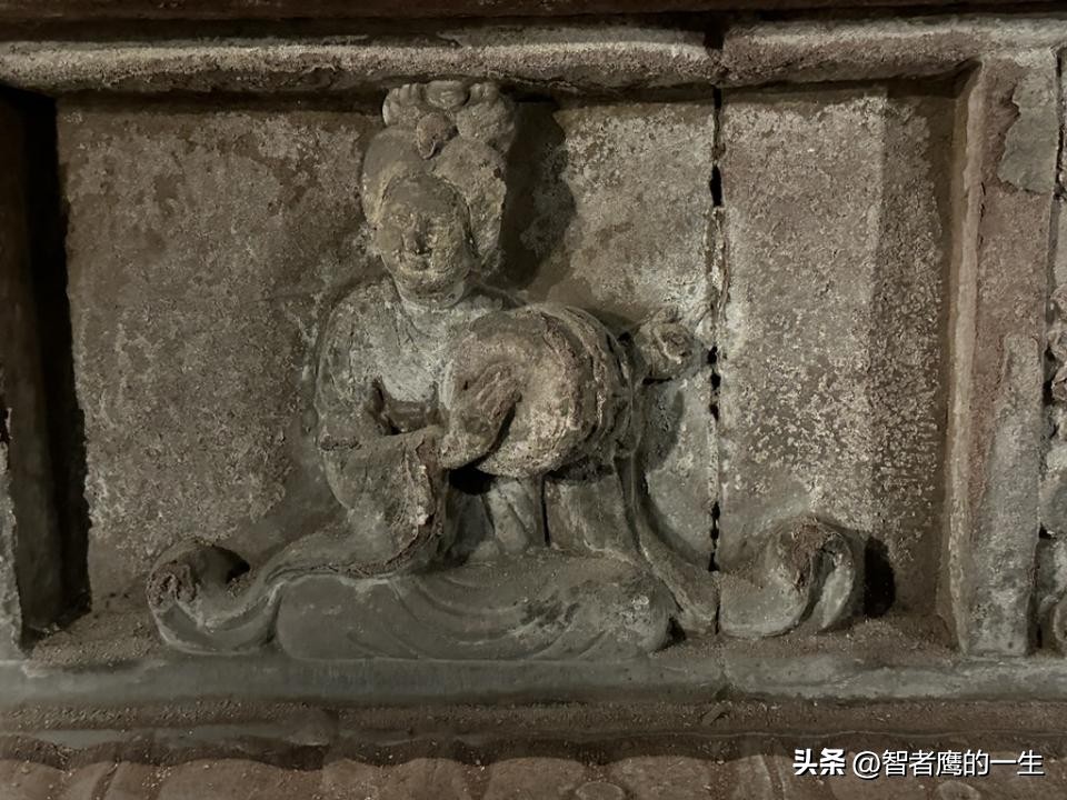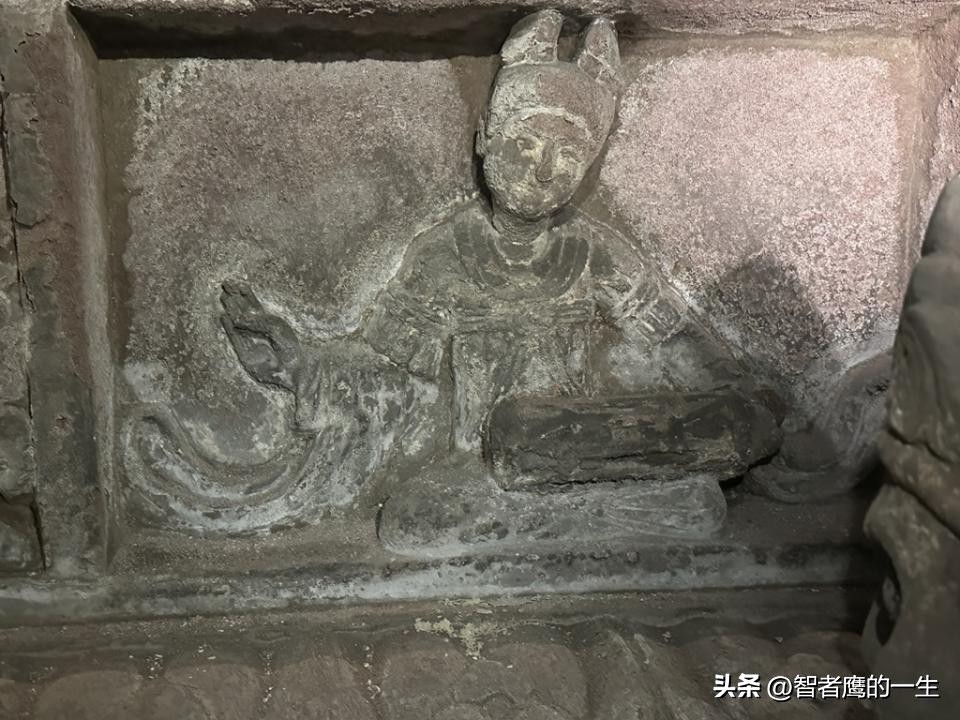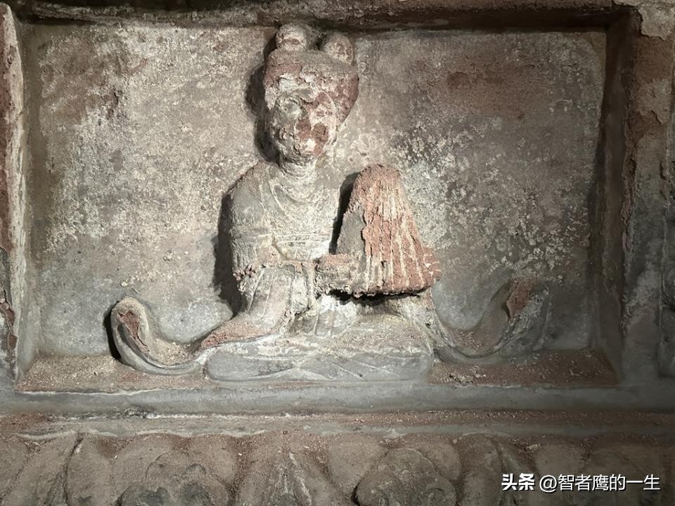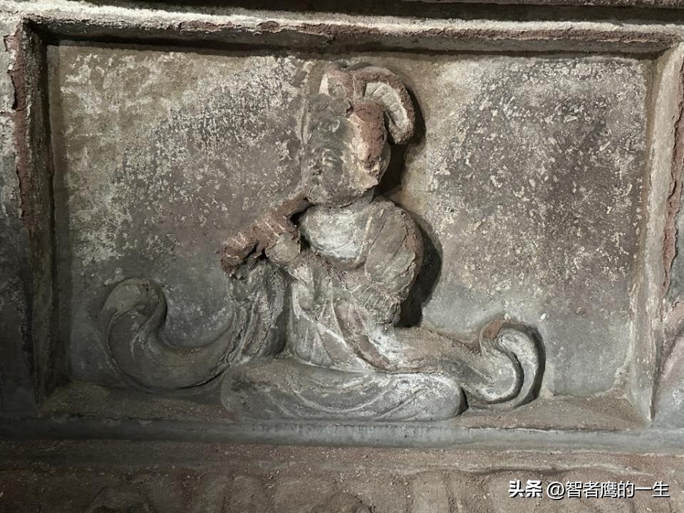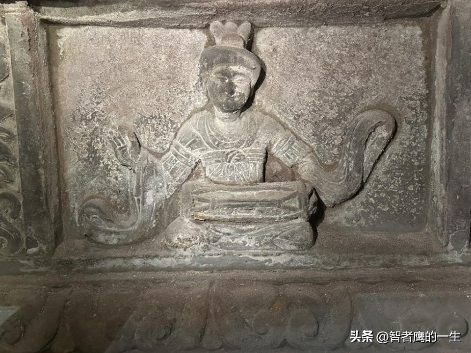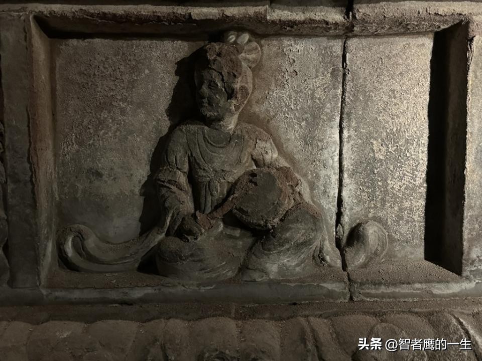 棺床为须弥座式,两侧列置十二力士半身雕像,作扶抬棺床之状,棺床东、西、南三面浮雕24名乐伎,其中舞者2人,奏乐者22人,操着琵琶、拍板、筚篥、笙、箫、笛、鼓、吹叶等,弹、击、拍、吹各种乐器共20种23件,乐伎四周及棺床北面饰龙、凤、云纹、花卉等图案;我在前面发掘过程中已经展示了棺床的十二力士,此处重点展示一下棺床四周的二十四歌伎,这些都是国家一级文物,考古价值极高,为了拍这些照片,我蹲下来环绕一周,累的够呛,但很值。