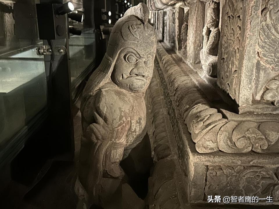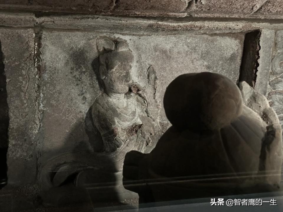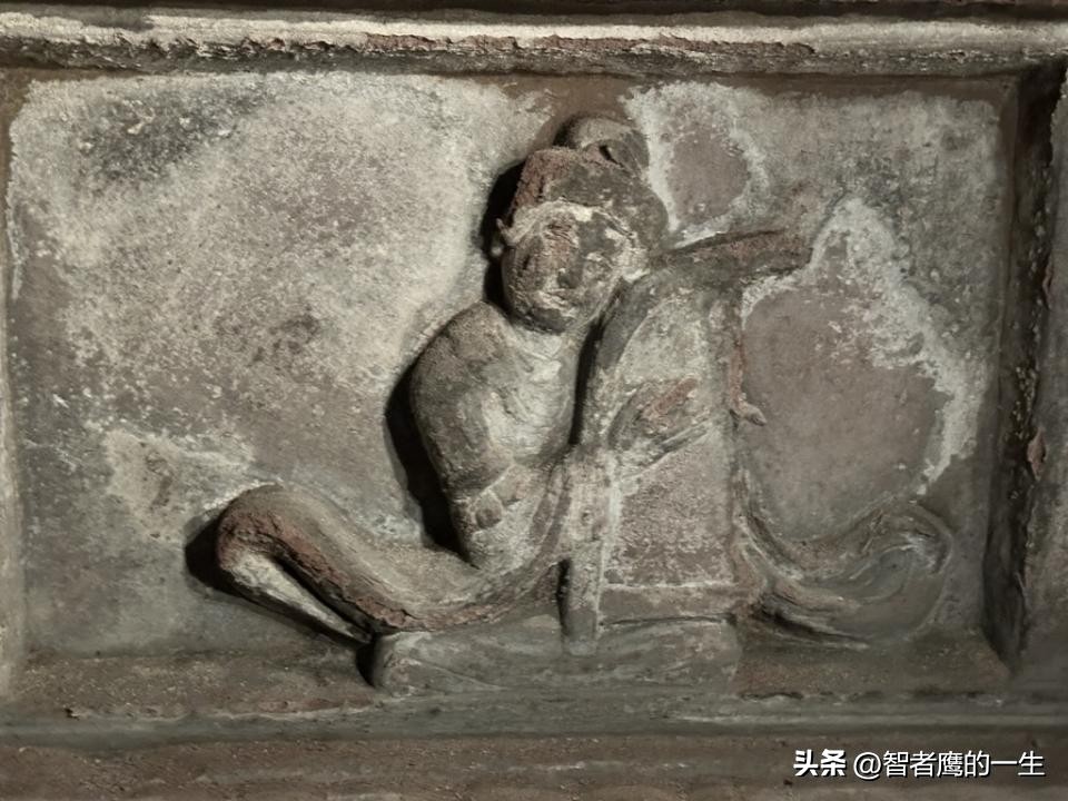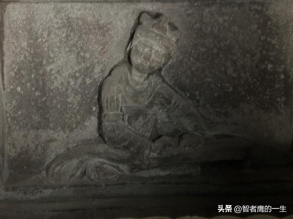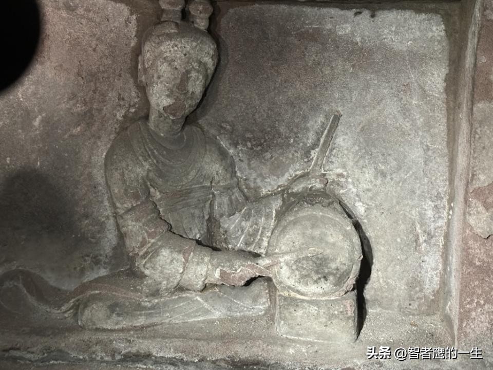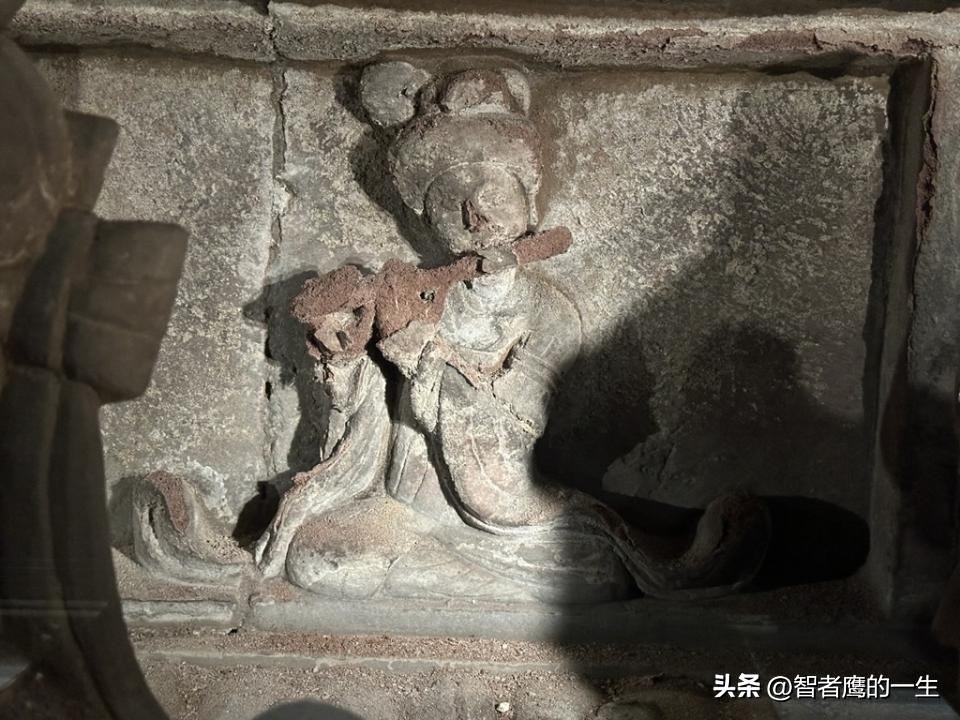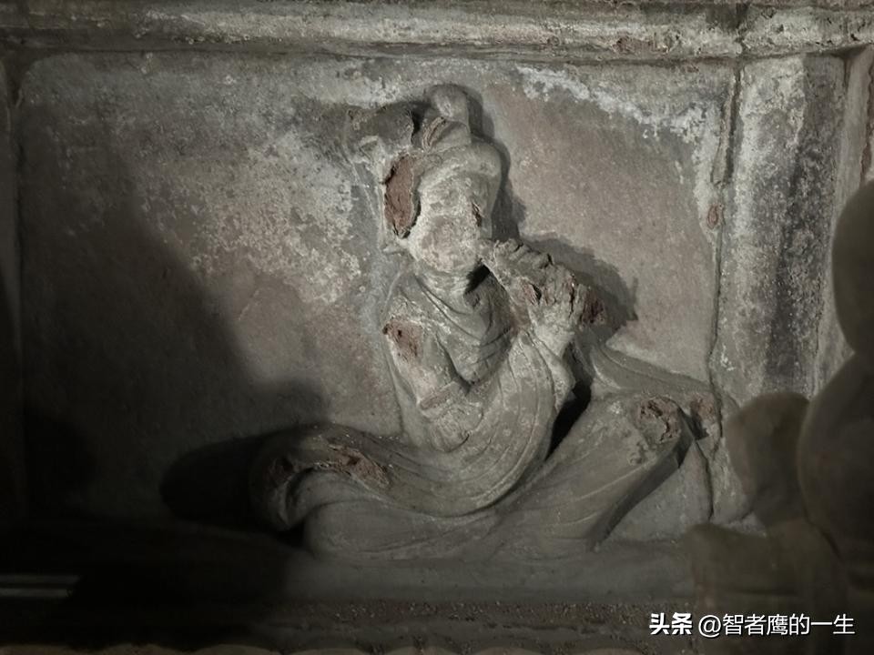 棺床为须弥座式,两侧列置十二力士半身雕像,作扶抬棺床之状,棺床东、西、南三面浮雕24名乐伎,其中舞者2人,奏乐者22人,操着琵琶、拍板、筚篥、笙、箫、笛、鼓、吹叶等,弹、击、拍、吹各种乐器共20种23件,乐伎四周及棺床北面饰龙、凤、云纹、花卉等图案;我在前面发掘过程中已经展示了棺床的十二力士,此处重点展示一下棺床四周的二十四歌伎,这些都是国家一级文物,考古价值极高,为了拍这些照片,我蹲下来环绕一周,累的够呛,但很值。