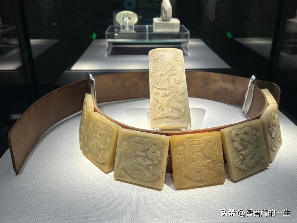 玉大带是古代帝王配置的玉腰带,会因为身份等级不同,而使用不同的材质制造,由于已过千年,永陵中这条玉大带原有的红 都已腐。正面全都浮雕着蟠龙图案,八条盘龙同中有异,即整齐和谐,又变化生动。