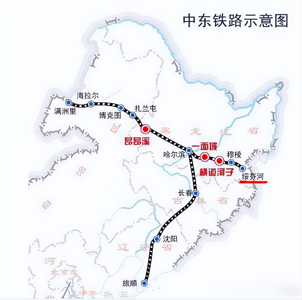 从线路图上可以看出,干线是东西一条直线,从俄国赤塔经中国满洲里、哈尔滨、绥芬河到达俄国符拉迪沃斯托克(海参崴)的西伯利亚铁路在中国境内的一段。中国在中间,两边连接着俄罗斯的国土,当时修建的时候,该部分作为沙俄帝国连结欧亚两洲西伯利亚大铁路的一部分。