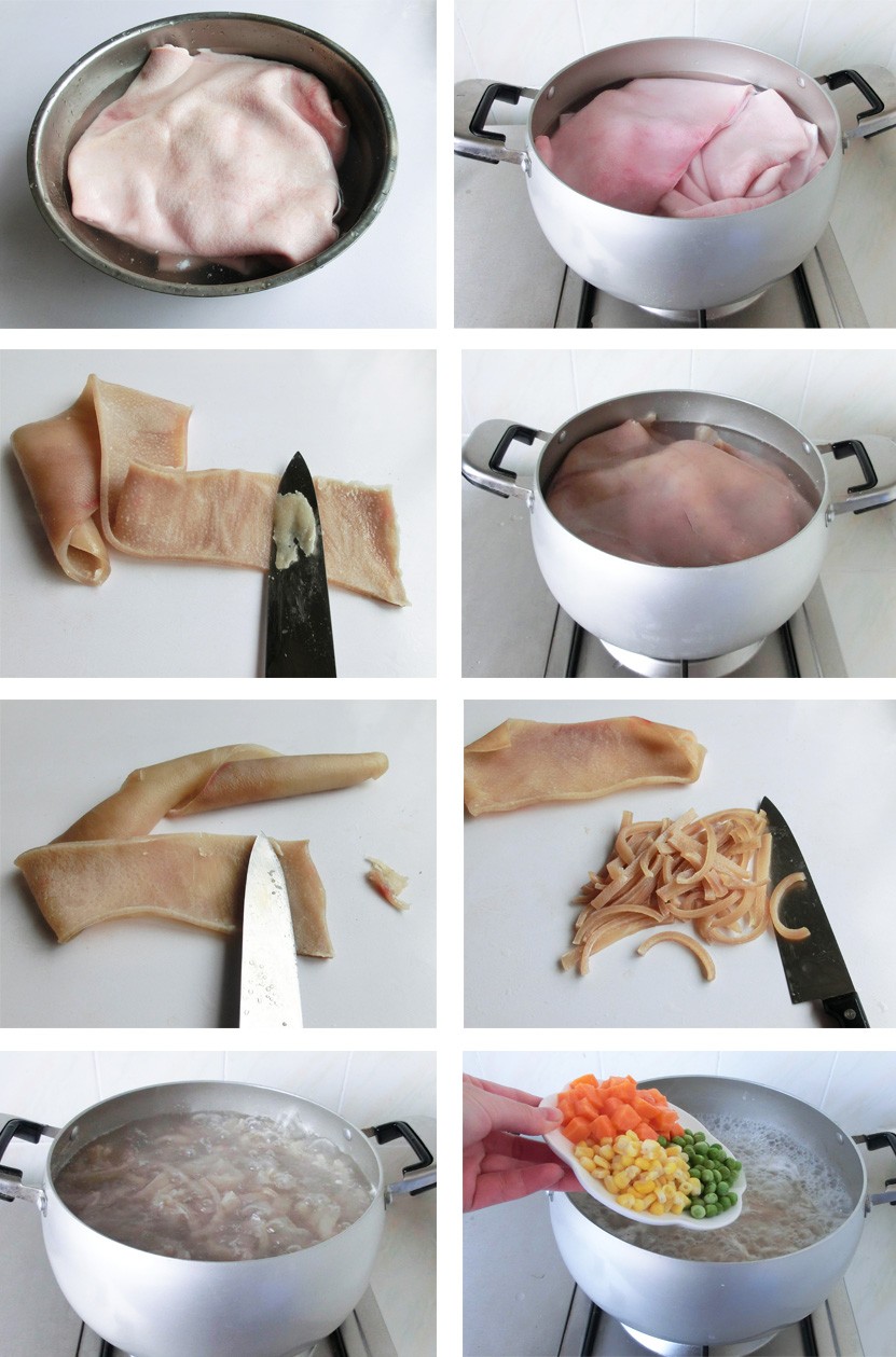 材料:生猪肉皮600克,胡萝卜粒30克,豌豆30克,玉米30克。