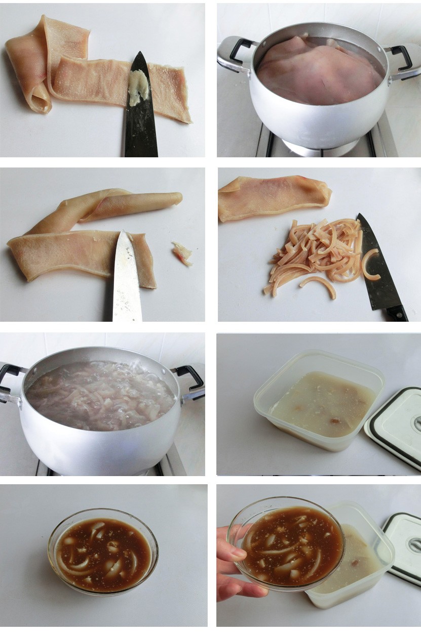 2、肉皮在处理时,一定要刮净肥油,可煮至六成熟后再用刀刮一遍,避免其中的油脂外溢。