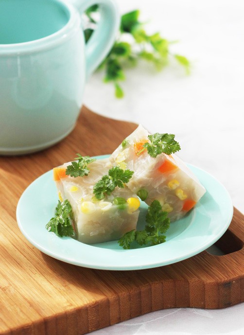 在原色冻里,加点蔬菜,或豆子,就成了蔬菜肉皮冻,充满弹性的肉皮冻包裹着点点胡萝卜与黄豆,看起来分外晶莹。不但口感韧劲十足,而且还带回了肌肤的光洁与细嫩。