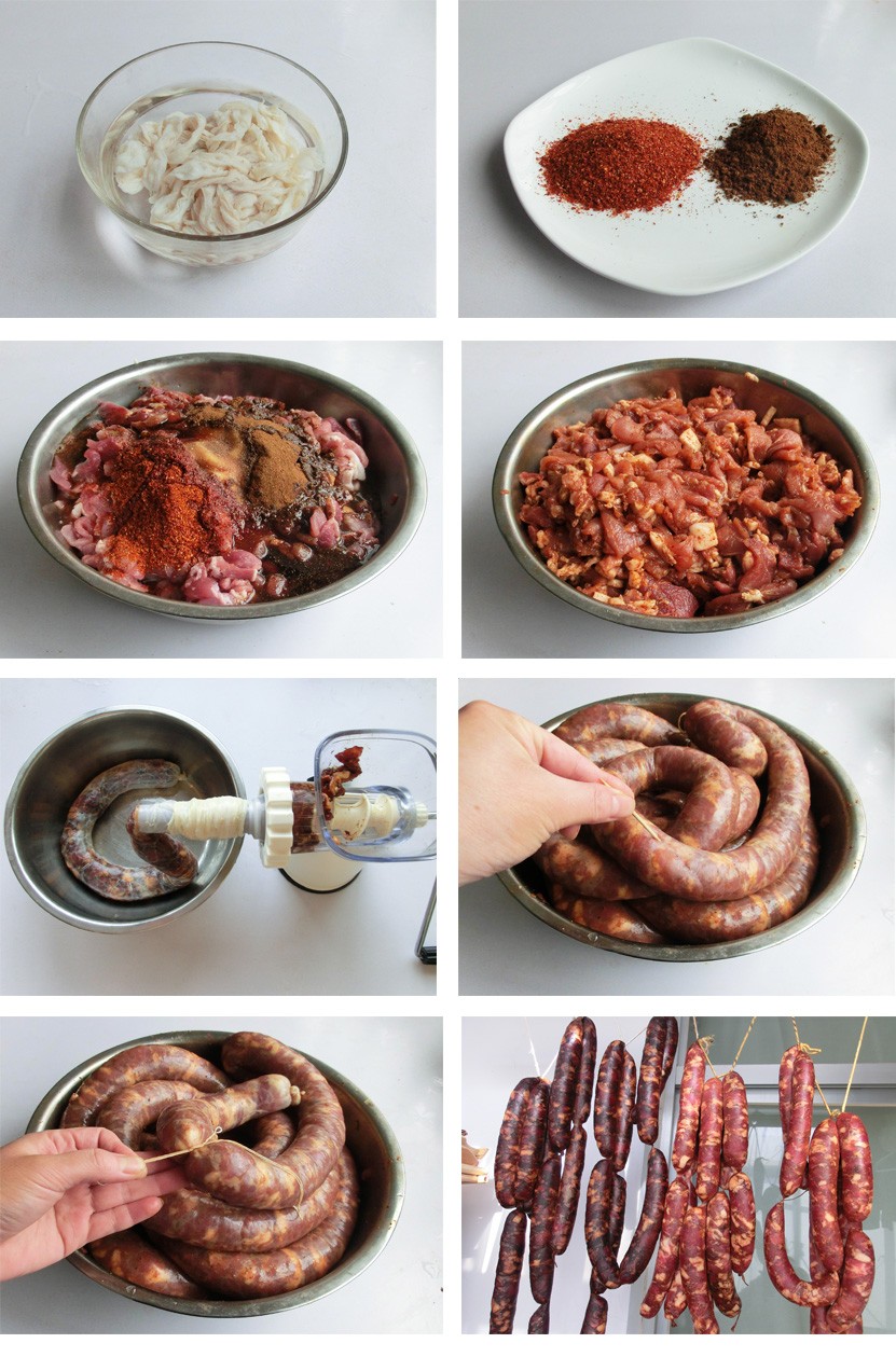 材料:肥瘦猪肉(肥瘦比例为3:7)2500克,盐75克,醪糟汁100克,白酒25克,辣椒20克,花椒15克,麻椒10克、白糖10克、生抽25克、猪肠衣5米