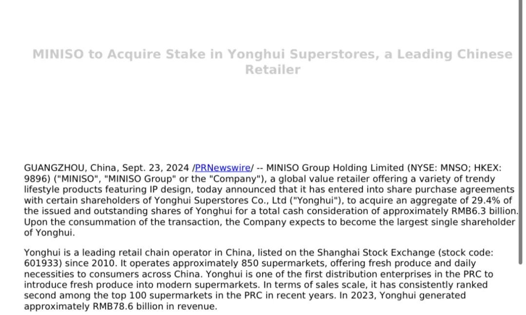 9月23日晚间,名创优品宣布,全资子公司骏才国际斥资62.70亿元收购商超行业巨头永辉超市29.4%的股权。本次收购完成后,骏才国际将成为永辉超市第一大股东。