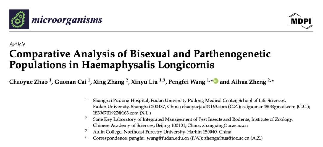 2024年4月19日,王鹏飞团队等在 Microorganisms 期刊发表了题为:Comparative Analysis of Bisexual and Parthenogenetic Populations in Haemaphysalis Longicornis 的研究论文。