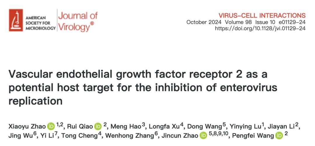 2024年9月17日,王鹏飞团队在 Journal of Virology 期刊发表题为:Vascular endothelial growth factor receptor 2 as a potential host target for the inhibition of enterovirus replication 的研究论文。
