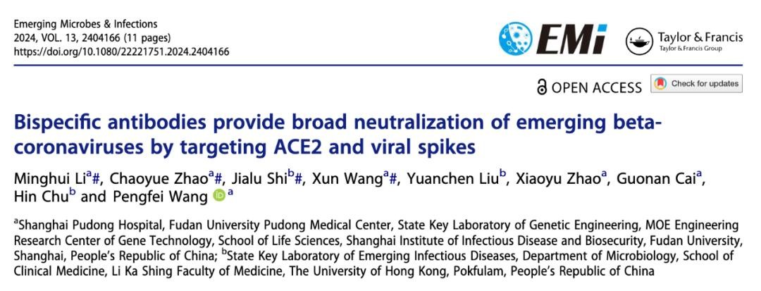 2024年9月11日,王鹏飞团队在 Emerging Microbes & Infections 期刊发表题为:Bispecific Antibodies Provide Broad Neutralization of Emerging Beta-Coronaviruses by Targeting ACE2 and Viral Spikes 的论文。