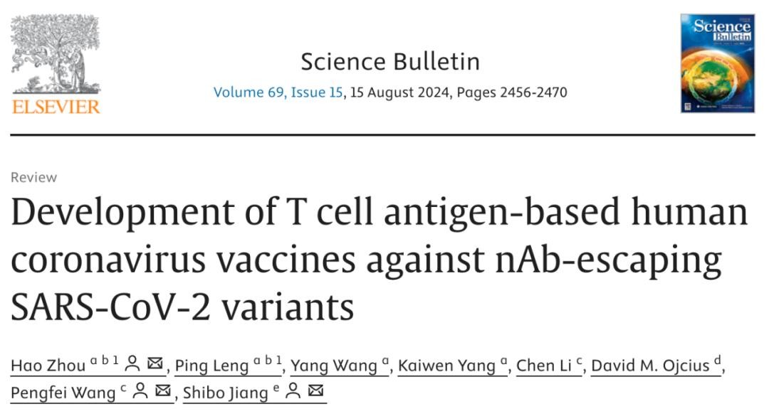 2024年8月15日,王鹏飞团队等在 Science Bulletin 期刊发表了题为:Development of T cell antigen-based human coronavirus vaccines against nAb-escaping SARS-CoV-2 variants 的综述论文。