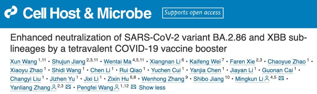 2024年1月10日,王鹏飞团队在 Cell 子刊 Cell Host & Microbe 上发表题为:Enhanced neutralization of SARS-CoV-2 variant BA.2.86 and XBB sub-lineages by a tetravalent COVID-19 vaccine booster 的研究论文。