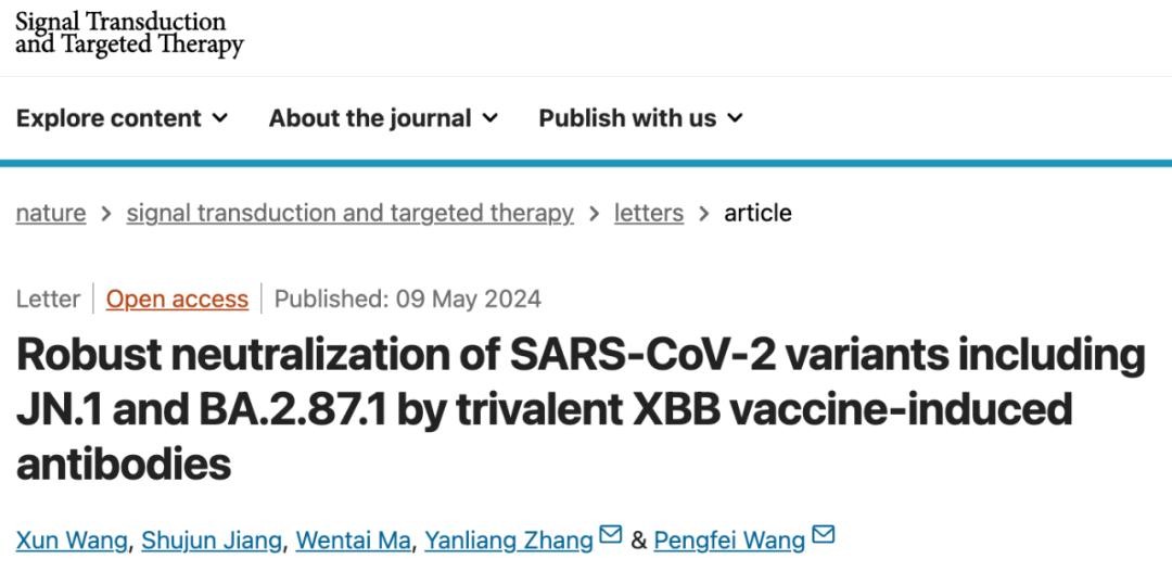2024年5月9日,王鹏飞团队在 Signal Transduction and Targeted Therapy 期刊发表了题为:Robust neutralization of SARS-CoV-2 variants including JN.1 and BA.2.87.1 by trivalent XBB vaccine-induced antibodies 的研究论文。