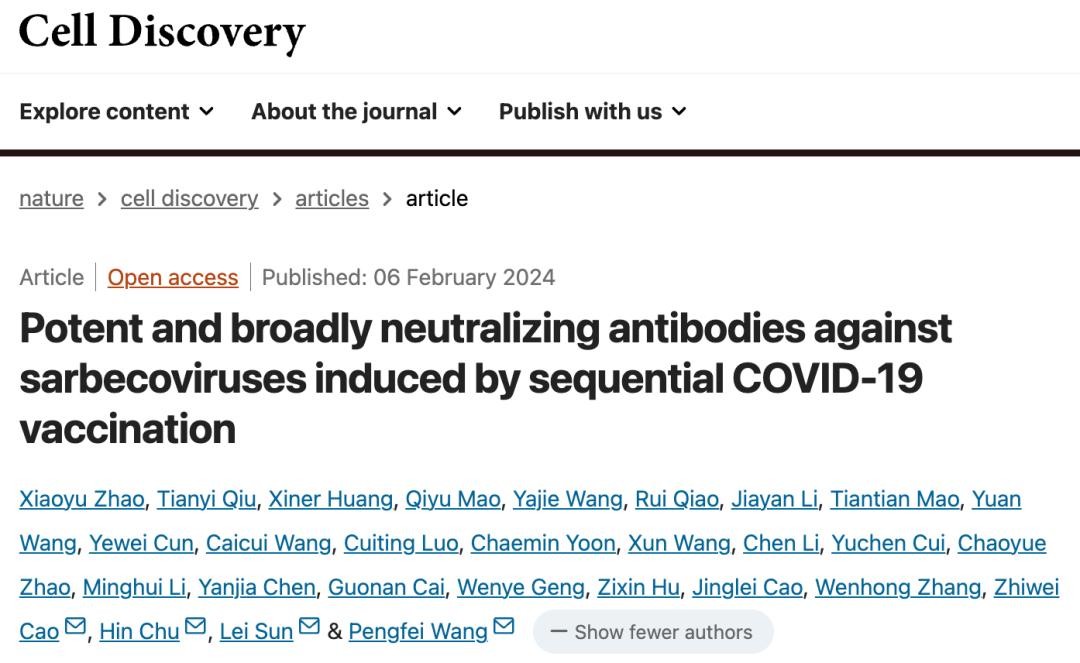 2024年2月6日,王鹏飞团队在 Cell Discovery 期刊发表了题为:Potent and broadly neutralizing antibodies against sarbecoviruses induced by sequential COVID-19 vaccination 的研究论文。