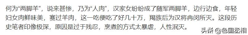 需要注意的是,苻登军队吃人的情形,同样与自媒体文章描述的不尽相同。苻登军吃的是在战场上斩杀的敌军,并不专门俘虏百姓来吃,更不专挑汉人来吃,更没有关于奸淫妇女的记载。