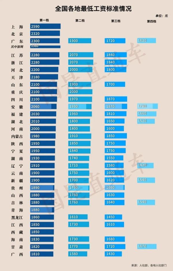 上述四地调整后,全国已有15个省份最低工资标准加入“2000元俱乐部”。其中上海最高,为2590元。紧随其后的是北京(2320元)和广东(2300元,其中深圳2360元)。