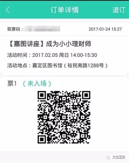 当您未在“文化嘉定云”终端机取票,均可在活动前一天24:00前(活动当天不可退票),登录文化嘉定云网站,进入“我的订单-我的活动”中退票。若该场活动预订多张票时,您可以选择退订部分或者全部。(如果您已经在“文化嘉定云”终端机取票,就不可以再作退票处理咯!)
