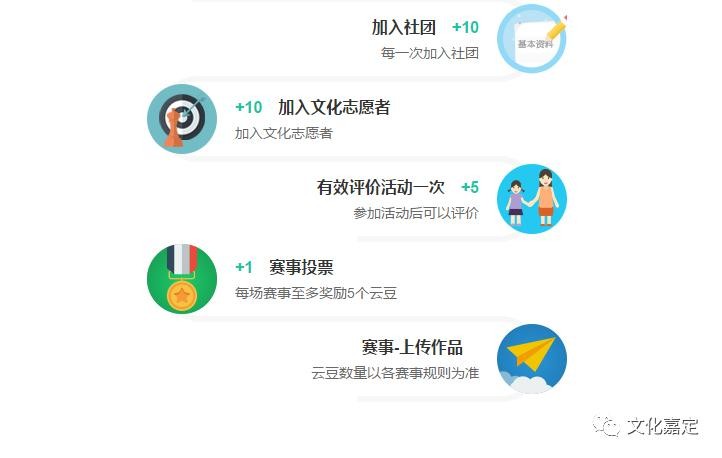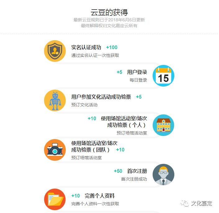 “云豆”是文化嘉定云平台用户对嘉定区公共文化做出贡献和享受相应文化权益的标记。用户遵守相应规则和履行相应义务,并对我区公共文化的活跃度作出贡献,便可通过“云豆”的积累享有更好的服务。这将有助于我们建立嘉定公共文化圈的公序良俗,更好地维护公共资源的合理与高效使用,共同营造更加公平公正、有礼有序的文化氛围。