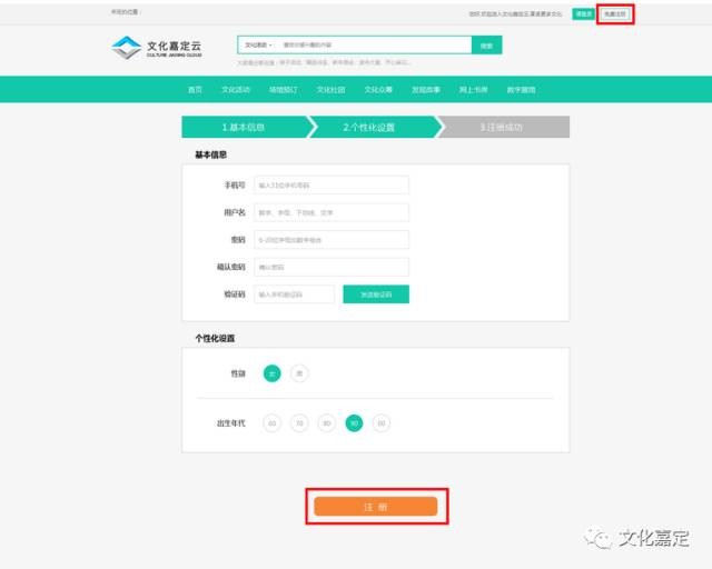 点击“文化嘉定云”网站(www.whjd.sh.cn)右上方“免费注册”;