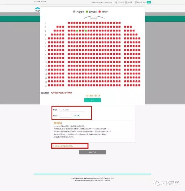 选择预订数量,您可选择预订票数为1-3张(视活动规则而定),单场活动订票不得超过3张;正确输入验证码;请您务必仔细阅读预订须知;确定订单信息无误,点击“提交订单”;