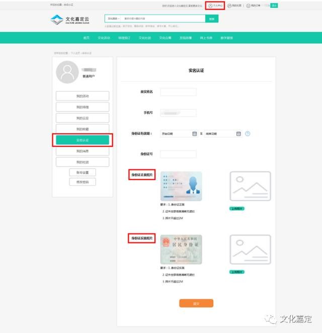 登录“文化嘉定云”网站www.whjd.sh.cn;进入“个人中心”,点击“实名认证”;