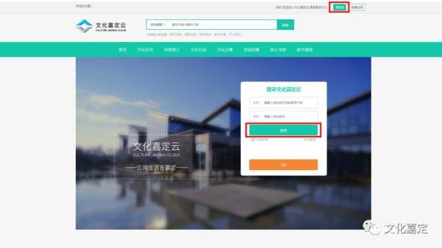 点击“文化嘉定云”网站(www.whjd.sh.cn)右上方“请登录”;