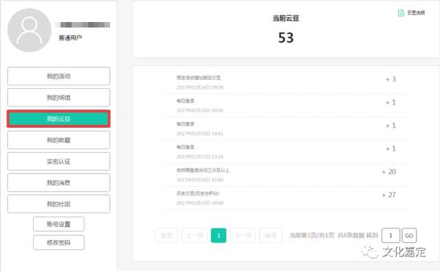 用户可登录“文化嘉定云”网站www.whjd.sh.cn,在首页“云豆”进入“我的云豆”查询云豆记录。除了部分热门文化活动的预订是针对云豆用户开放之外,用户使用云豆积分还可以换取相应的电影演出票、热门文化场馆等入场门票。云豆活动可随时关注“文化嘉定”微信公众号的推送新信息哦!